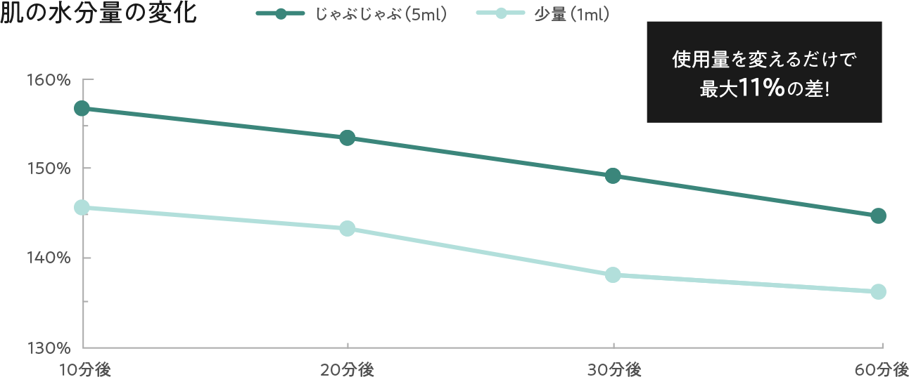 ルルルンローションを使って水分量の変化を計測すると、通常よりたくさんの化粧水を使ったほうが肌のうるおいが長持ちしました。