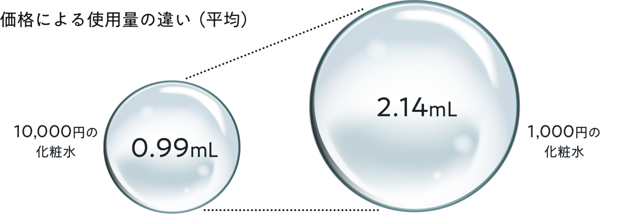 価格による使用量の違いも調べてみました。やっぱり高価な化粧水は“ちびちび”使いがち。千円の化粧水と一万円の化粧水を比べると、1回の使用量に46%もの違いがありました。毎日使うものだからこそ、惜しみなく使える価格にもこだわっています。