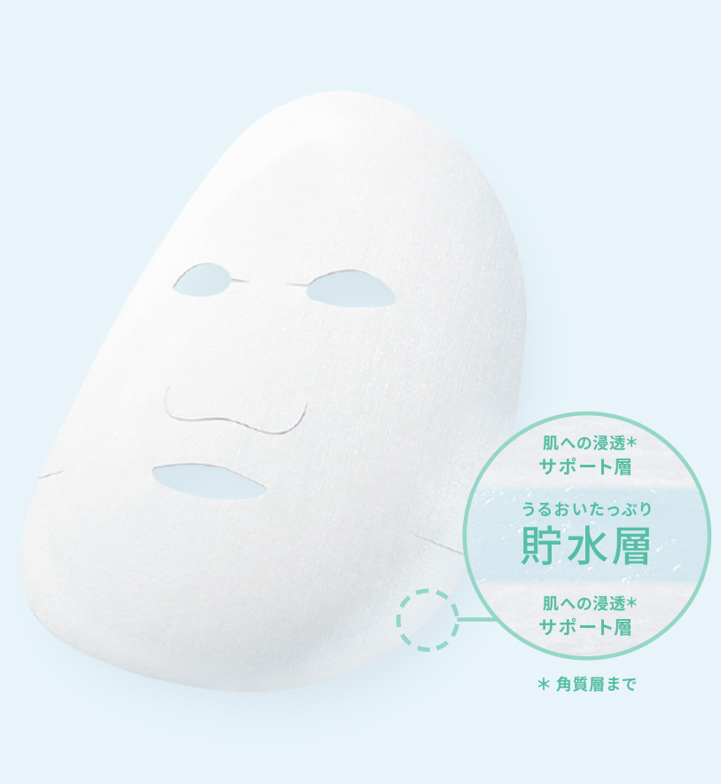 美容成分をふんだんに含んだ「うるおいたっぷり貯水層」を、付け心地のよい「肌への浸透*サポート層」で優しくサンドした、超極厚のふっくらシートを採用。化粧水をしっかり抱え込んで、じんわり肌をうるおします。