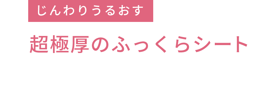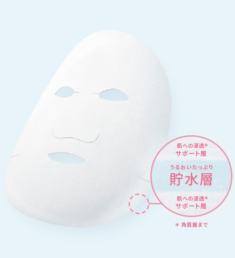 美容成分をふんだんに含んだ「うるおいたっぷり貯水層」を、付け心地のよい「肌への浸透*サポート層」で優しくサンドした、超極厚のふっくらシートを採用。化粧水をしっかり抱え込んで、じんわり肌をうるおします。