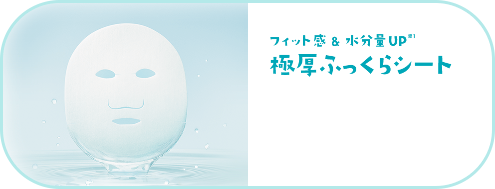 美容成分をたっぷり含んだ「うるおいたっぷり貯水層」を、付け心地のよい「肌への浸透※2 サポート層」で優しくサンドした、超極厚のふっくらシートを採用。うるおいがお肌に浸透するのをサポートします。