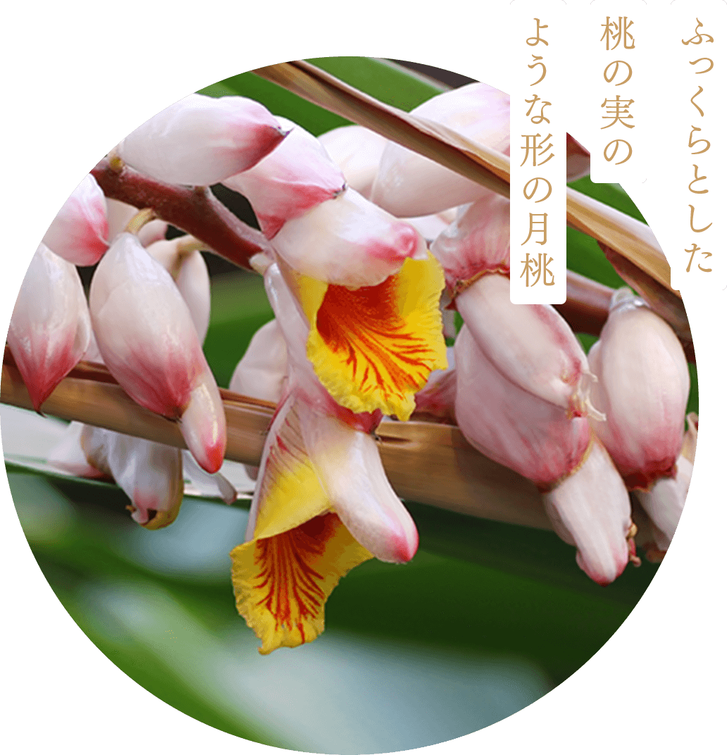 「さわやかな愛」の花言葉をもち、初夏になるとふっくらとした桃の実のような形の花を咲かせる月桃。沖縄の人々には、精油や健康茶、化粧品などとして、古くから親しまれてきました。