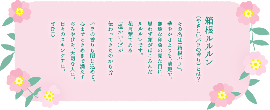 世界でも、ここ箱根エリアでしか見られない「箱根バラ」。たった1日しか花を咲かせないことから、満開の姿を見た人は幸せになれるという噂もあるのだとか。ルルルンはこの貴重な箱根バラを使って、世界で初めて*1箱根バラエキス*2をつくりました。ほのかに香るバラの香りとともに、肌を抱きしめるようにやさしくうるおいを届けます。