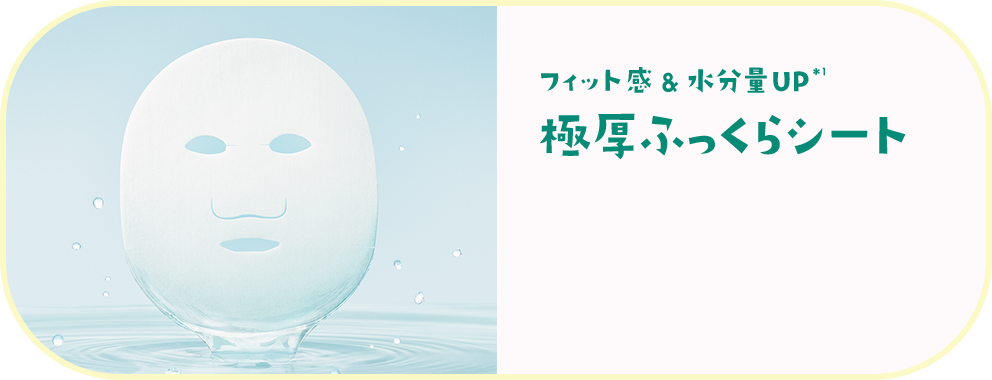 美容成分をたっぷり含んだ「うるおいたっぷり貯水層」を、付け心地のよい「肌への浸透*2サポート層」で優しくサンドした、超極厚のふっくらシートを採用。うるおいがお肌に浸透するのをサポートします。*1 当社従来品比 *2 角質層まで