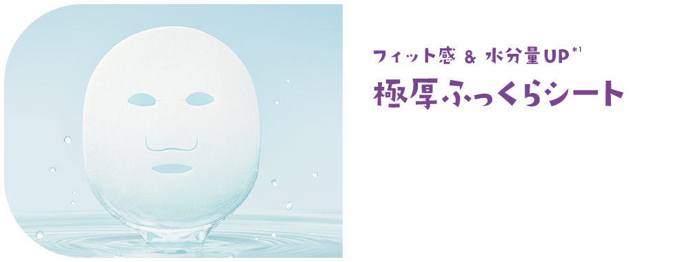 美容成分をたっぷり含んだ「うるおいたっぷり貯水層」を、付け心地のよい「肌への浸透*2サポート層」で優しくサンドした、超極厚のふっくらシートを採用。うるおいがお肌に浸透するのをサポートします。*1 当社従来品比 *2 角質層まで